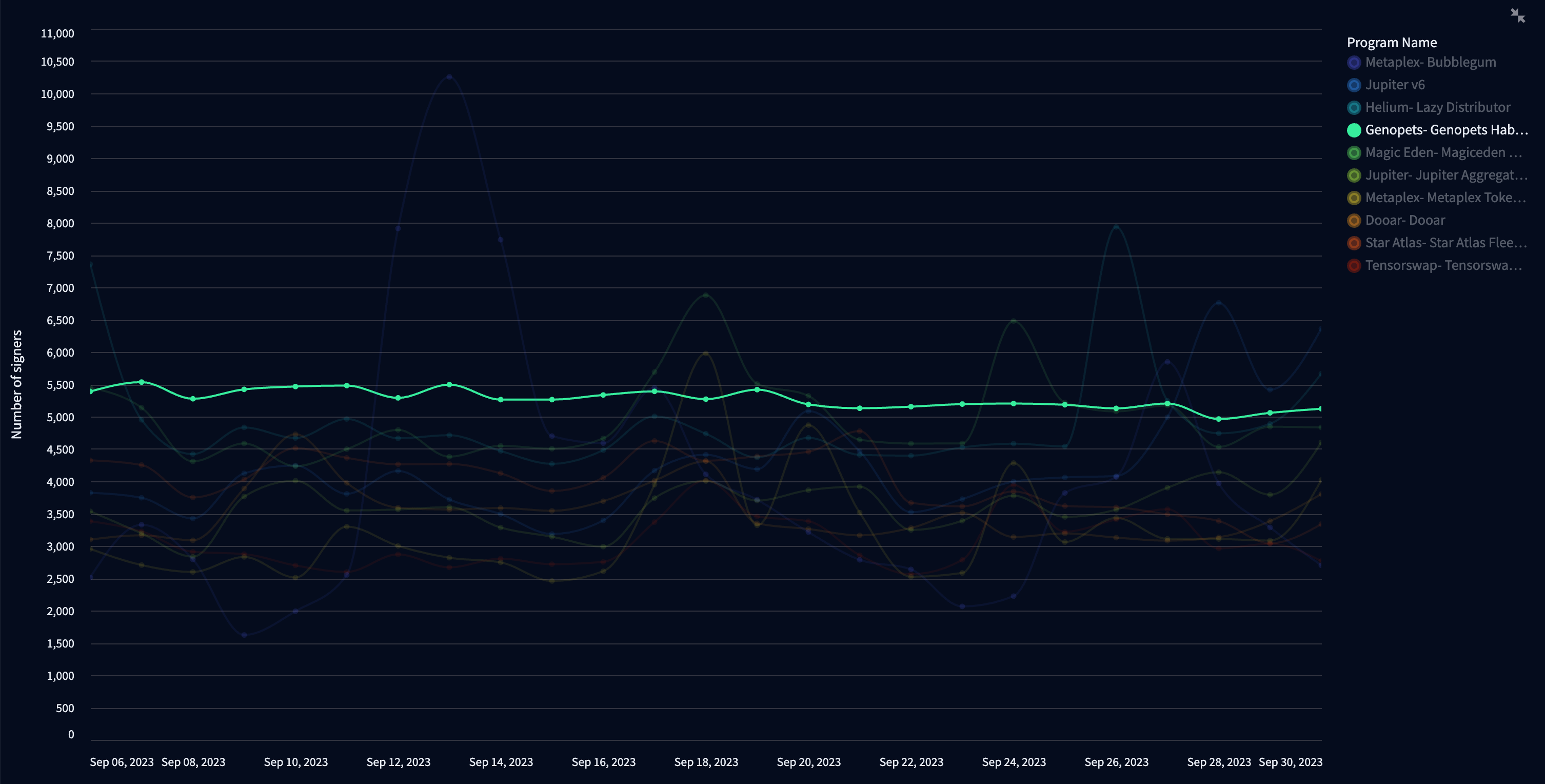 - Genopets contracts have consistently been in the top 3 most active contracts by daily active signers on the Solana network. In their Habitat Management program, thousands of unique signers daily convert energy from their steps to the KI Token.