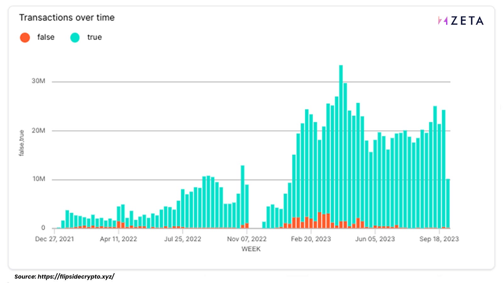 - Leveraging Solana's capacity, Zeta processed over 24.3M transactions last week, bringing it to 1B across its lifetime (five times that of Uniswap). With just 5k SOL in all-time gas fees and a transaction failure rate below 1% thanks to Solana's local fee markets upgrade, Zeta exemplifies efficiency and scalability.