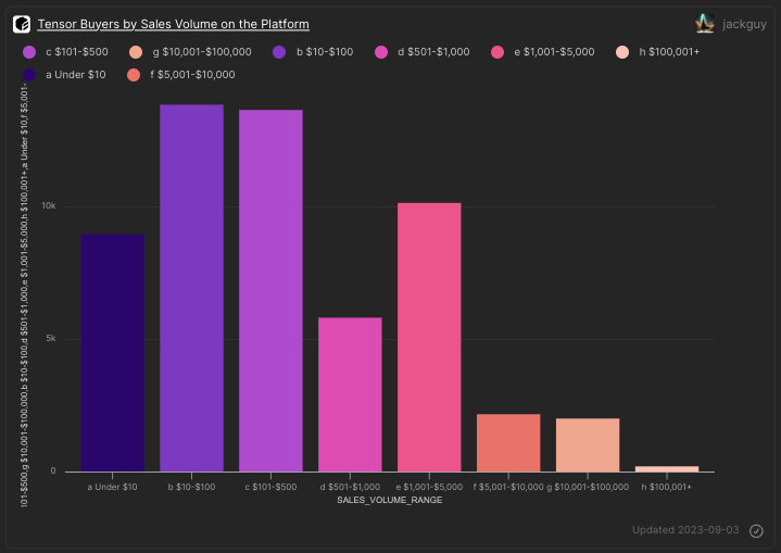 - Tensor HQ's buyer demographics reveal an intriguing mix, illustrating the platform's broad appeal. Half of Tensor's user base has spent under $500, signaling accessibility for casual buyers and newcomers to the NFT space. On the opposite end, 200 wallets have invested over $100,000.