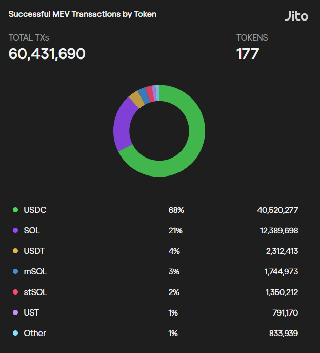 - In terms of MEV total Arb profits in USD, over the past year there has been more than $15M in profit. The majority of successful MEV transactions by tokens include: USDC (68%), SOL (21%), USDT (4%), and mSOL (3%). The MEV Profit / Block is around $0.23 for the past year.