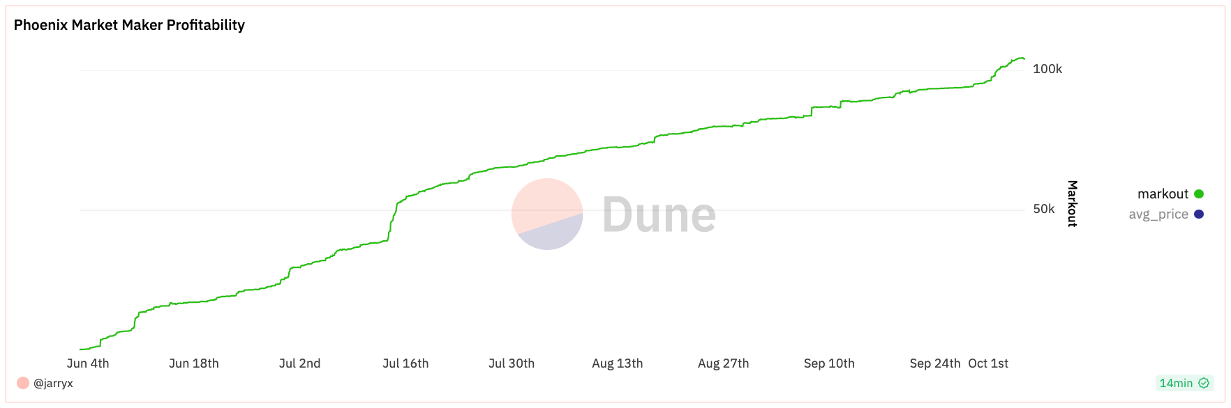 - Phoenix's market makers compete to provide the most competitive on-chain prices, leading to better prices for users. These sophisticated market makers are sustainably profitable—unlike AMM liquidity providers. During the four month period of June 4th, 2023, to October 4th, 2023, market makers on Phoenix profited over $100k.