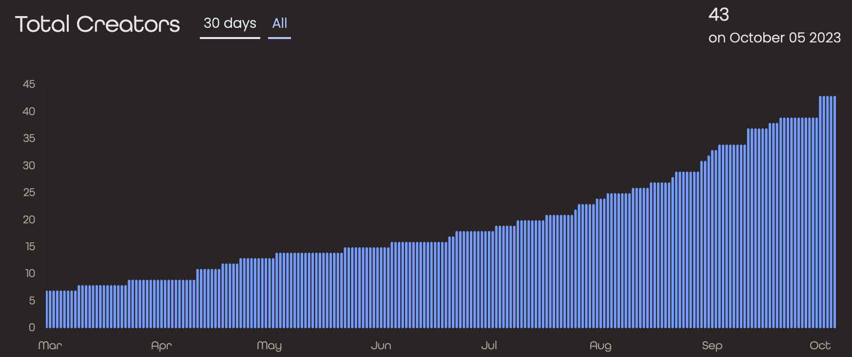- Access Protocol launched with 7 creators. In the last 8 months, Access has added 36 new creators, totaling 43. Creator onboarding is ramping up significantly, with more than half of creators onboarded since August.
