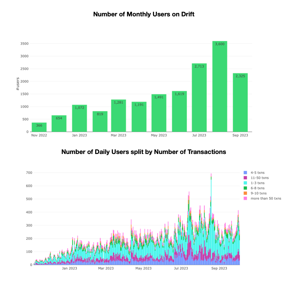 - Drift's monthly active users soared by 1,000% from 366 users in November 2022 to 3,600 users by August 2023. Nearly half engage in 1-3 trades daily, showcasing a prevalence of low-frequency retail traders in the platform, with only 2% of users categorized as high-frequency with 50+ daily trades.