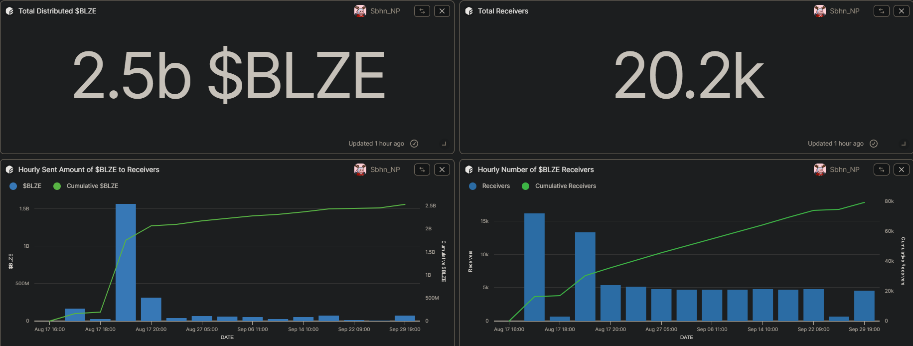 - The BLZE airdrop started on August 17th, distributing over 2.5 billion $BLZE tokens to 20.2k SolBlaze users. Staking more $SOL and utilizing $bSOL in DeFi increases your score and airdrop share.