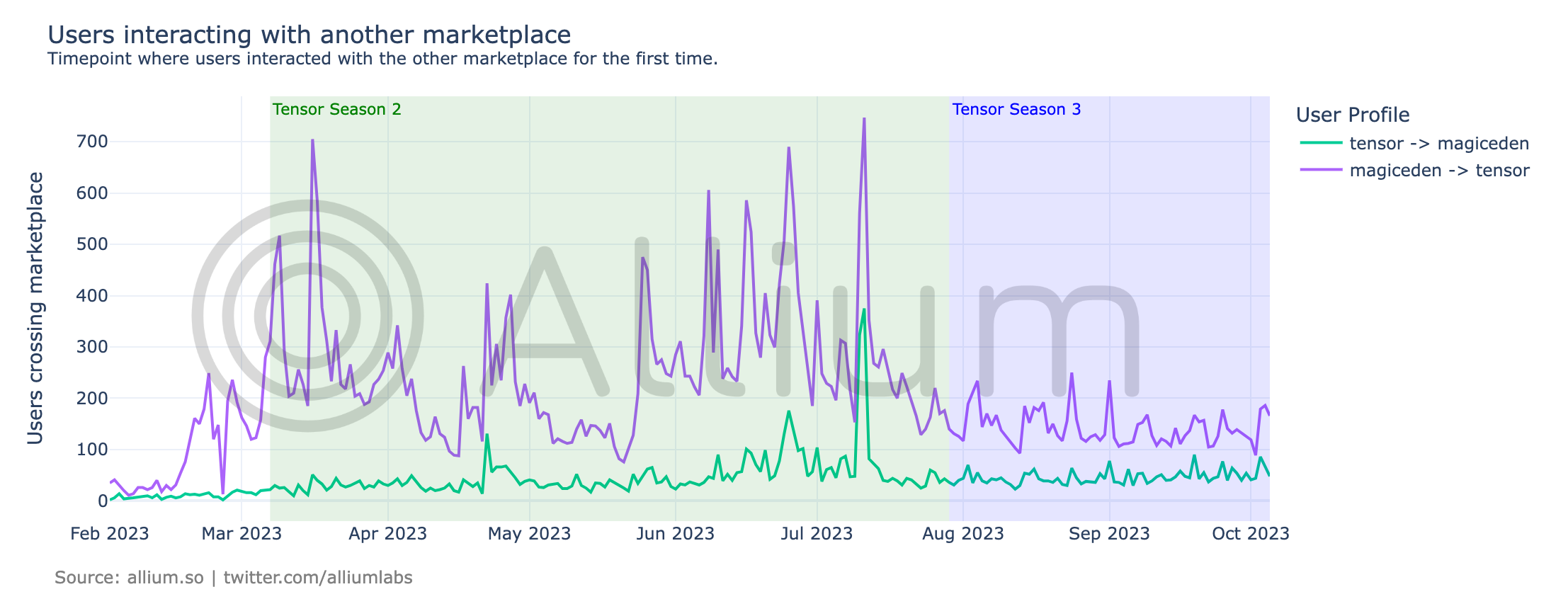 - Dual-marketplace users can either start with MagicEden or Tensor first and move on to trade on the other marketplace. This analysis identifies the dates where the users interacts with a new marketplace and determine their user type. The seasonal airdrop program run by Tensor has also lost its impact on pulling more MagicEden users. The number of daily users moving from MagicEden -> Tensor has declined from ~250 daily in Season 3 to ~140 daily in Season 3. Meanwhile, the number of users moving from Tensor to MagicEden has remained constant, at around 40+ a day.