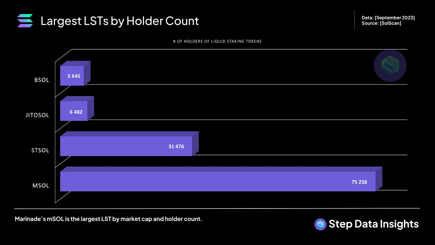 - mSOL is the first liquid staking token on Solana and has surpassed 75,000 wallets. mSOL is Solana's largest stake pool, representing 5.5M SOL staked. Lido's stSOL, which has the second most wallets (31,476), has voted to sunset operations on Solana, so other Solana LSTs should benefit.