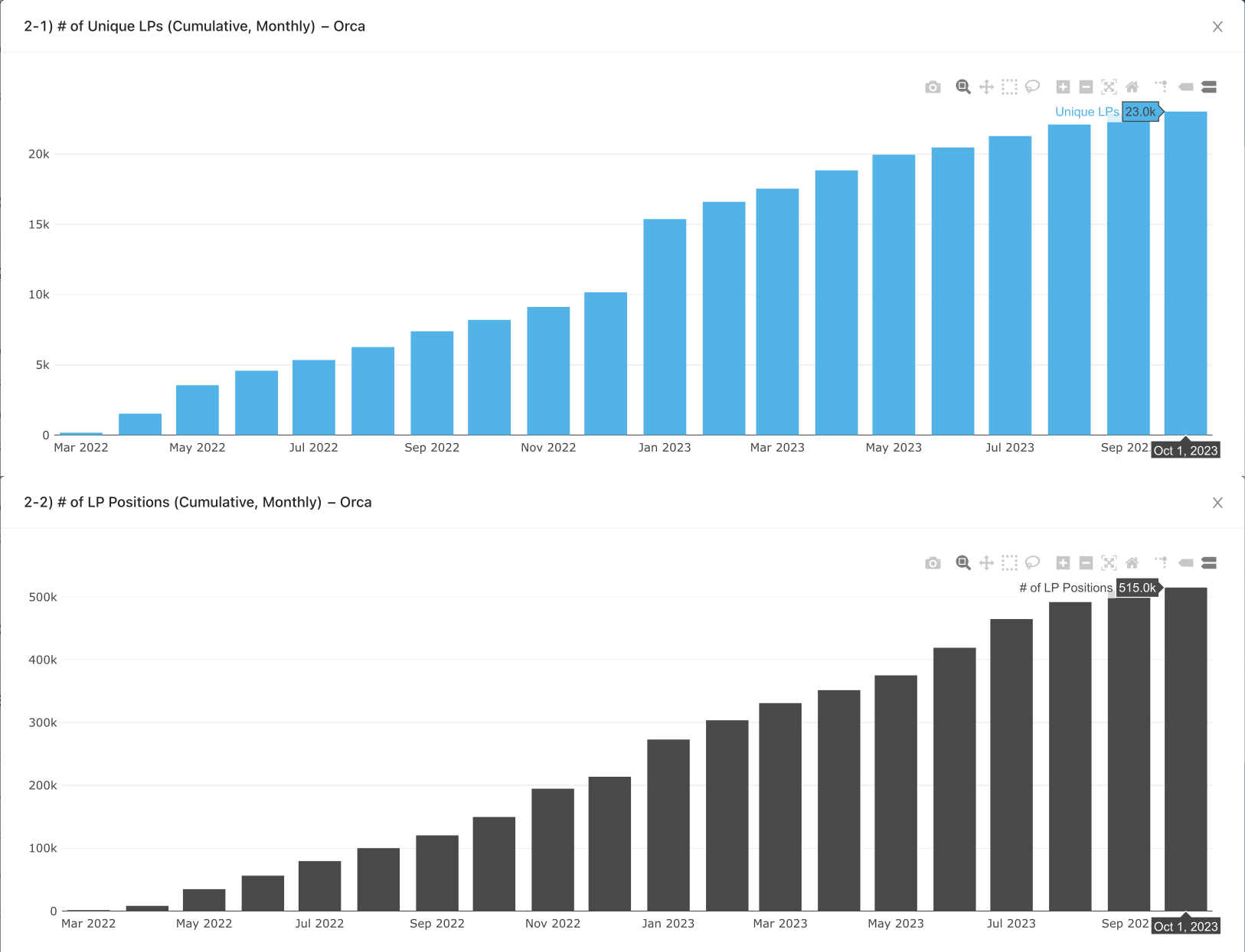 - 23k unique wallet addresses have created concentrated liquidity positions on Orca, creating a total of over 515k positions. While many of these LPs create positions using Orca’s UI, advanced traders can also create strategies that generate positions using Orca’s SDK.