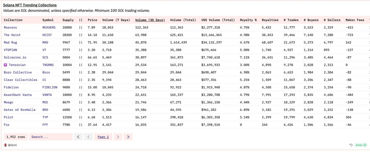 - There are 100 collections with over 1000 SOL in volume in the last 30 days; many are newly deployed (less than 6 months old). Royalties on most collections sit around 5%, and each collection has at least 1000 traders.