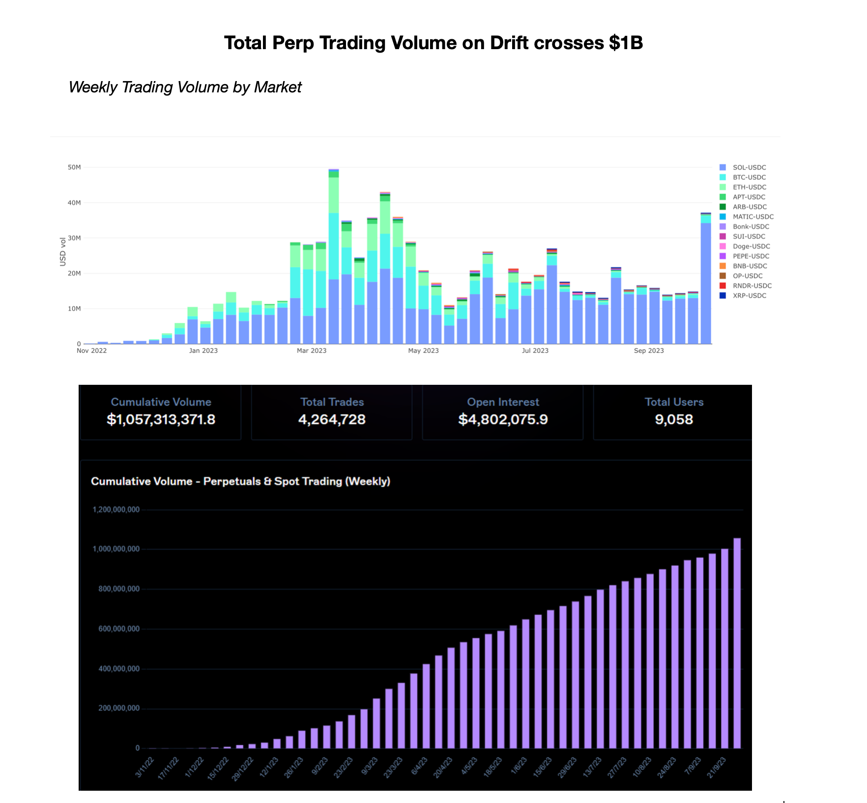 - Drift Protocol is a perpetual futures decentralized exchange (DEX) on Solana. Drift has recently crossed over $1B in trading volume across its perpetual futures and spot markets, which includes markets for BTC, ETH, SOL and 20+ other altcoins. Majority (>60%) of Drift's volume is concentrated on trading SOL-PERP and BTC-PERP, with spikes in altcoin volume when altcoins are surging. Drift has accommodated >4.2M trades over the year and now has ~$5M in open interest (value of open perpetual positions).