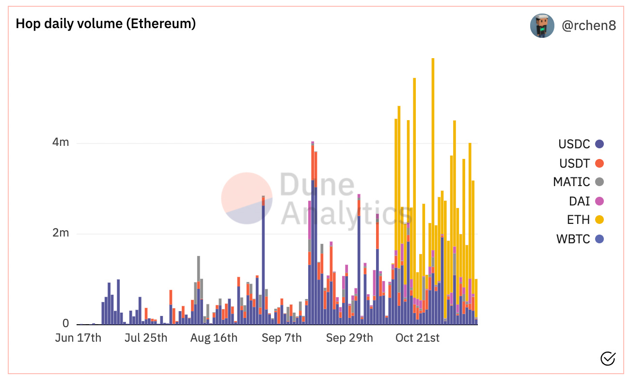 - Volumes on Hop really started picking up significantly when $ETH support was added last month. Since then, $ETH transfers make up more volume than USDC, USDT, DAI, and MATIC combined. The graph below is incomplete, but internal data shows that the daily $ETH transfer volume averaged $10M last week.