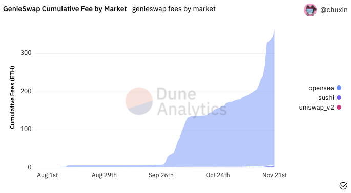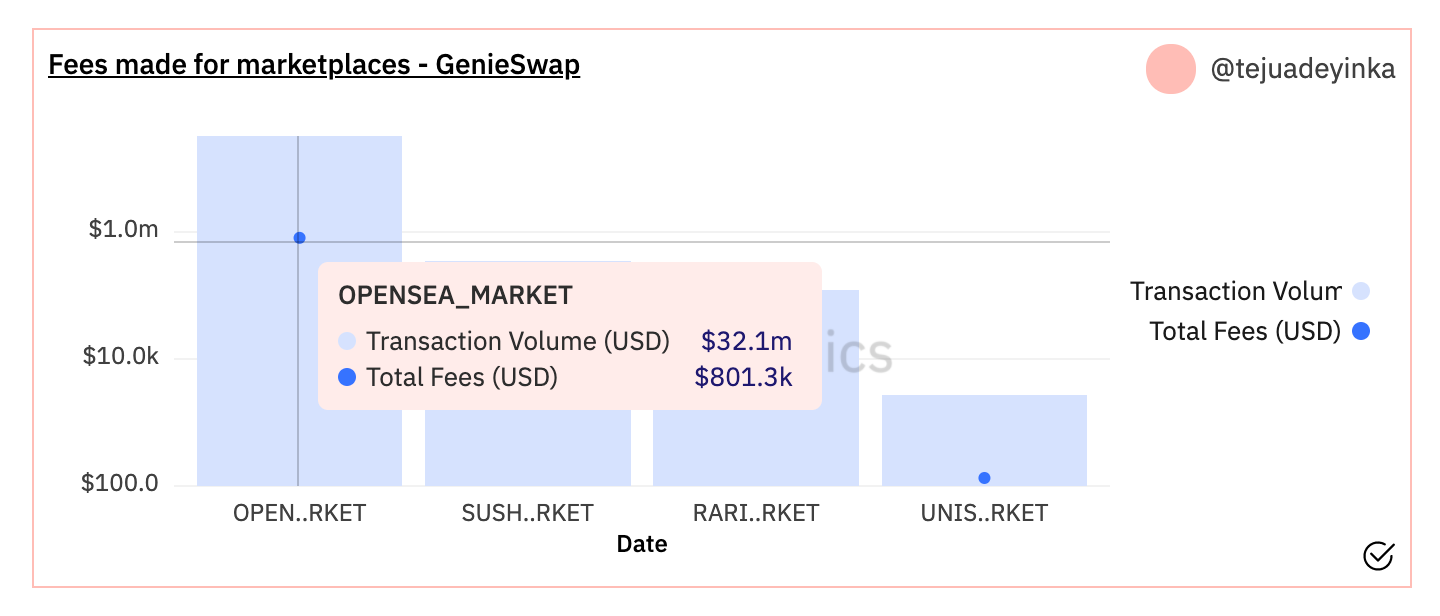 - While Genie aggregates NFT trades from several marketplaces, 98% ($32M) of all completed trades have been done through OpenSea, accruing revenue of $801K. The rest of the trades have been completed through Sushi Swap Market and Rarible.