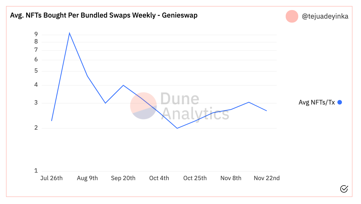- Over the last week, for the transactions where users traded multiple NFTs at once, an average of 3 NFTs were bought in one swap.