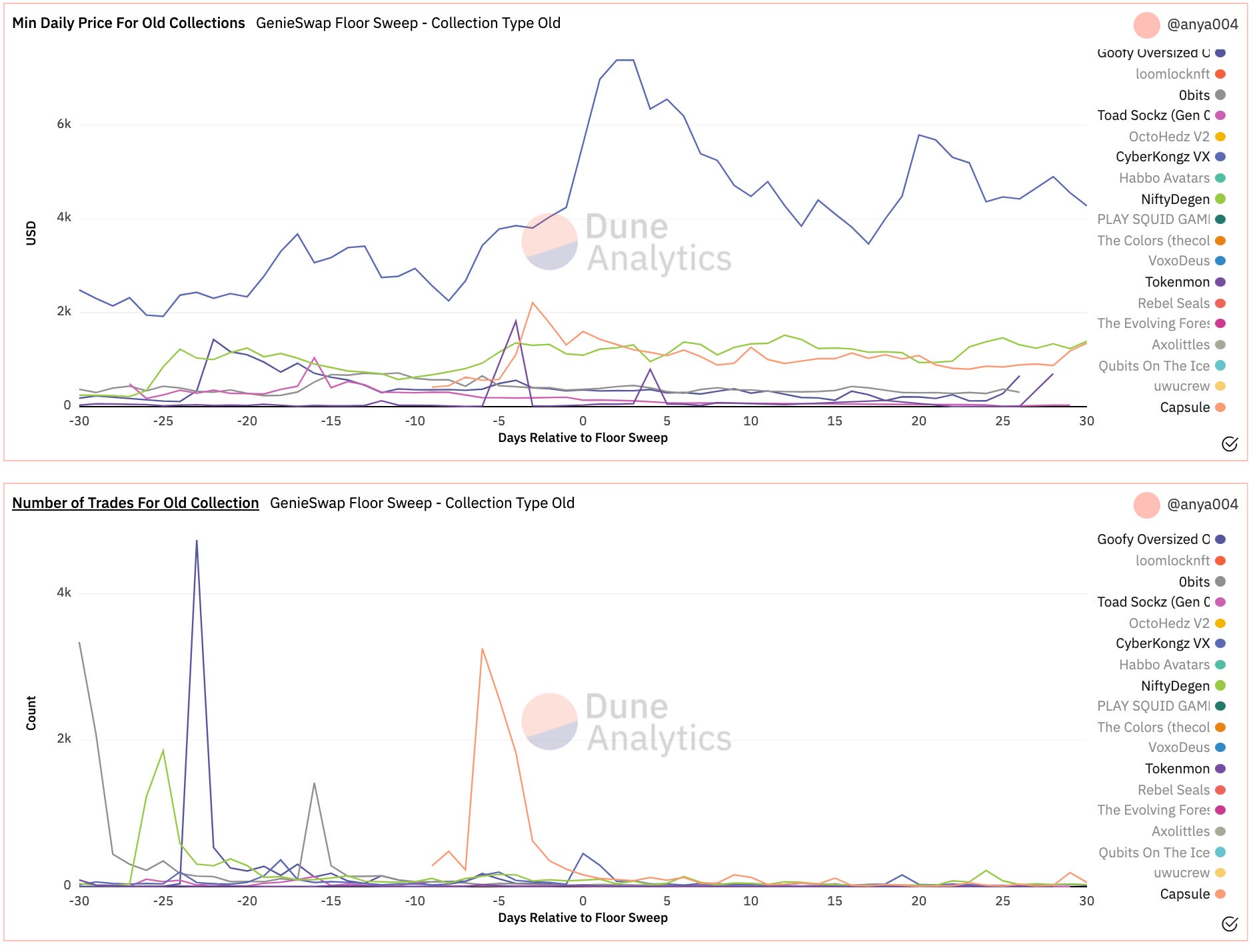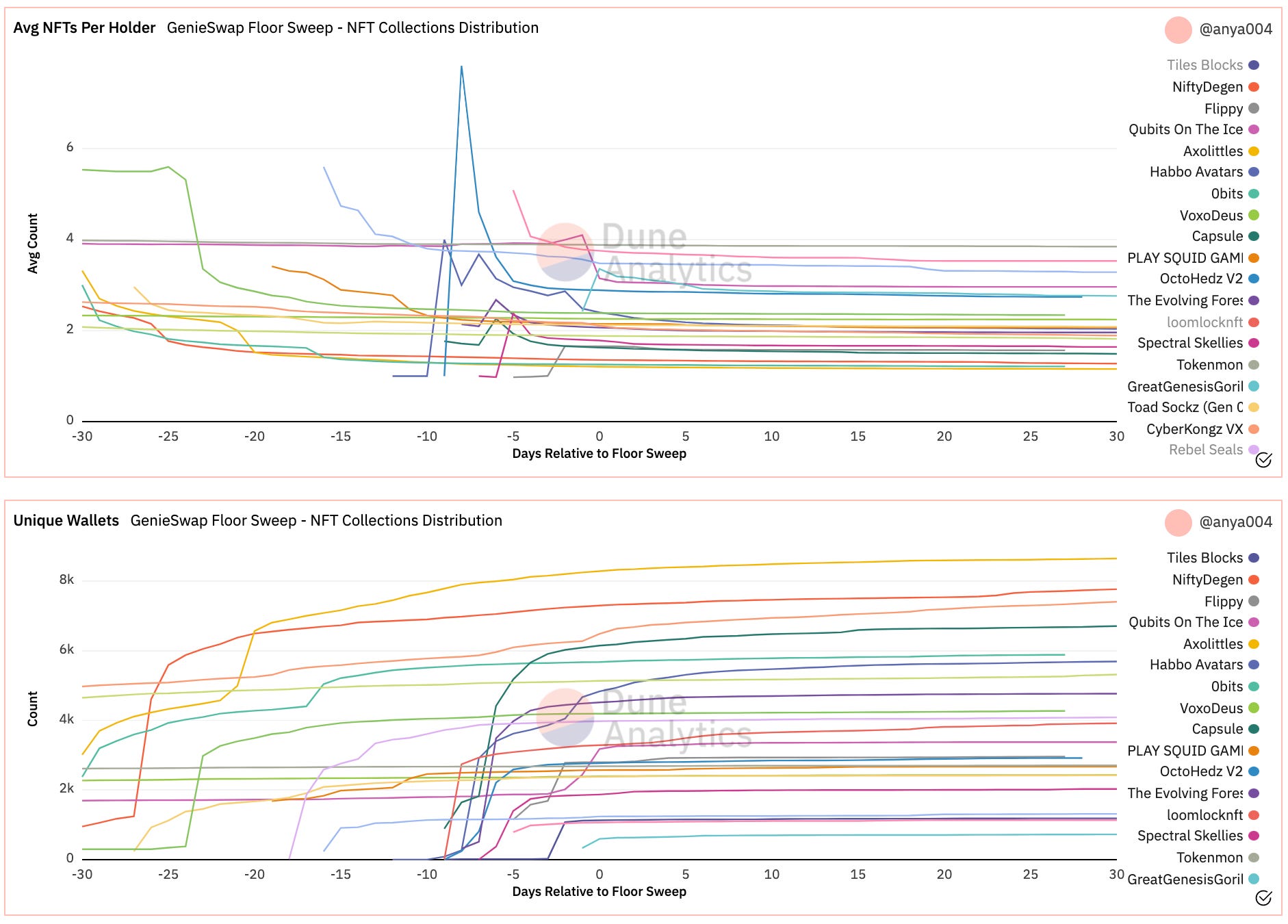 - Floor sweeping in more mature collections seems to be a gamble with the floor price going in either direction while token trades decrease.