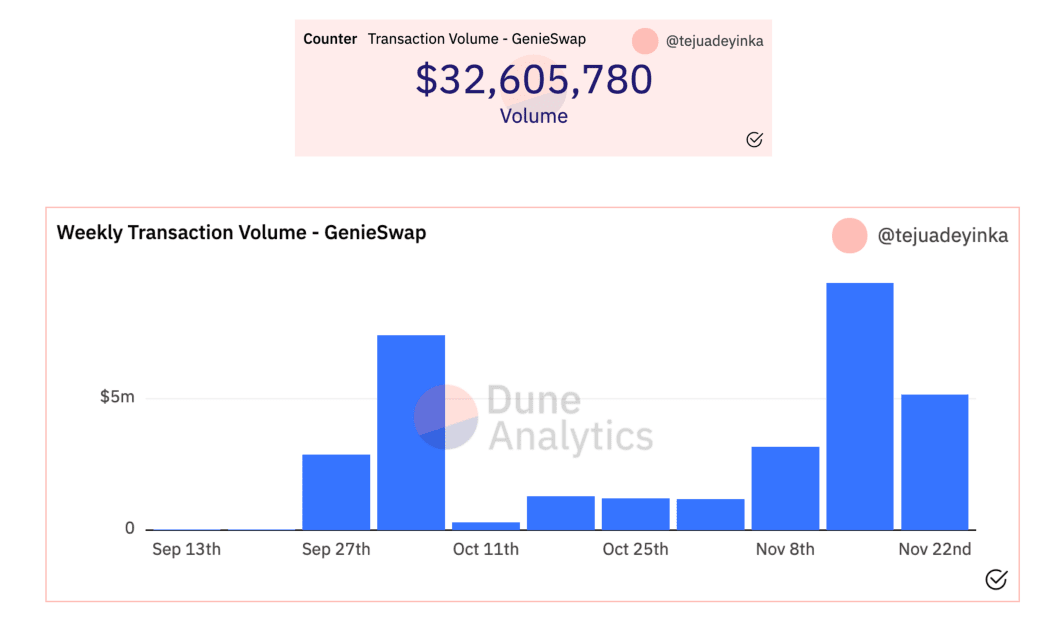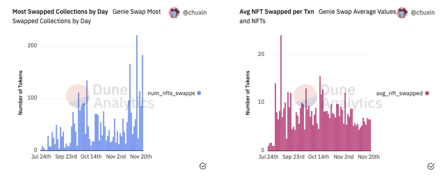 - Genie is an NFT marketplace aggregator that enables users to batch buy and sell NFTs in one transaction easily. Although they launched in stealth mode earlier in the year, they opened up the platform to the public last week. While they've done ~$32.6M worth of swaps in total since their beta launch, nearly half of that ($14.5M) was done in the last six days after their public announcement.