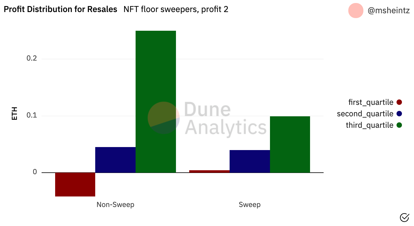 - Upon resell, the 25th percentile of sweep buyers is making a slight profit, whereas non-sweep buyers are taking a moderate loss. However, upside for sweep buyers is more limited compared to non-sweep buyers. The profit for non-sweep buyers in the 75th percentile is more than double that of sweep buyers.