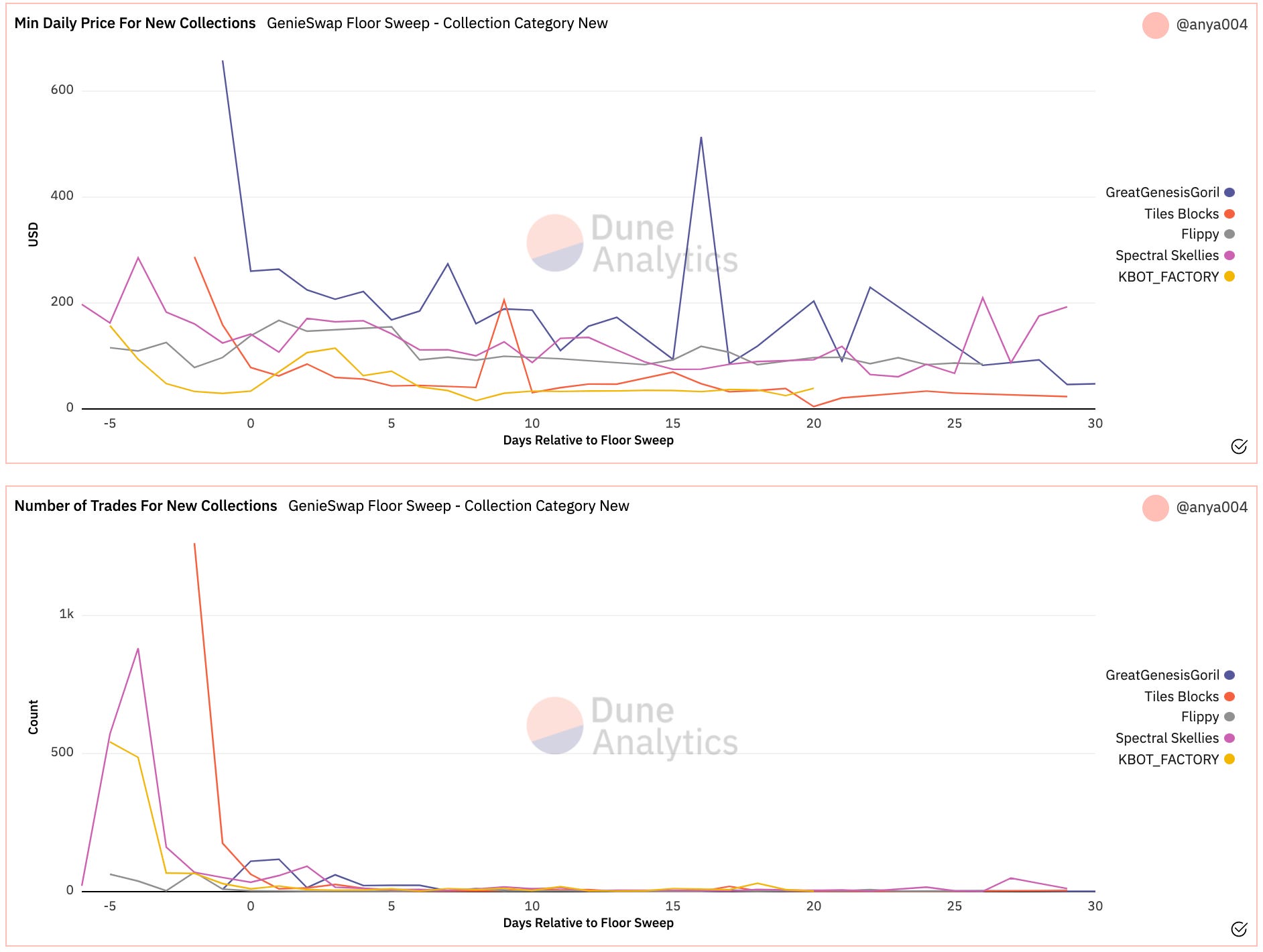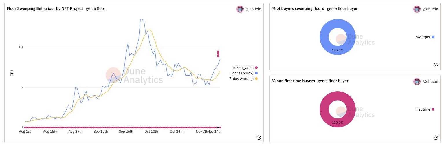 - Genie allows users to buy and sell multiple NFTs in a single transaction. This allows for floor sweeping, a strategy of buying the cheapest NFTs in a collection in hopes to raise the floor price in the market. There are two distinct groups where sweeps happen: newly minted NFT collections and collections that undergo a price dip. Floor sweeping in newly minted collections shows to be unfavorable, with both the price and amount of tokens being traded trending downward the following days.